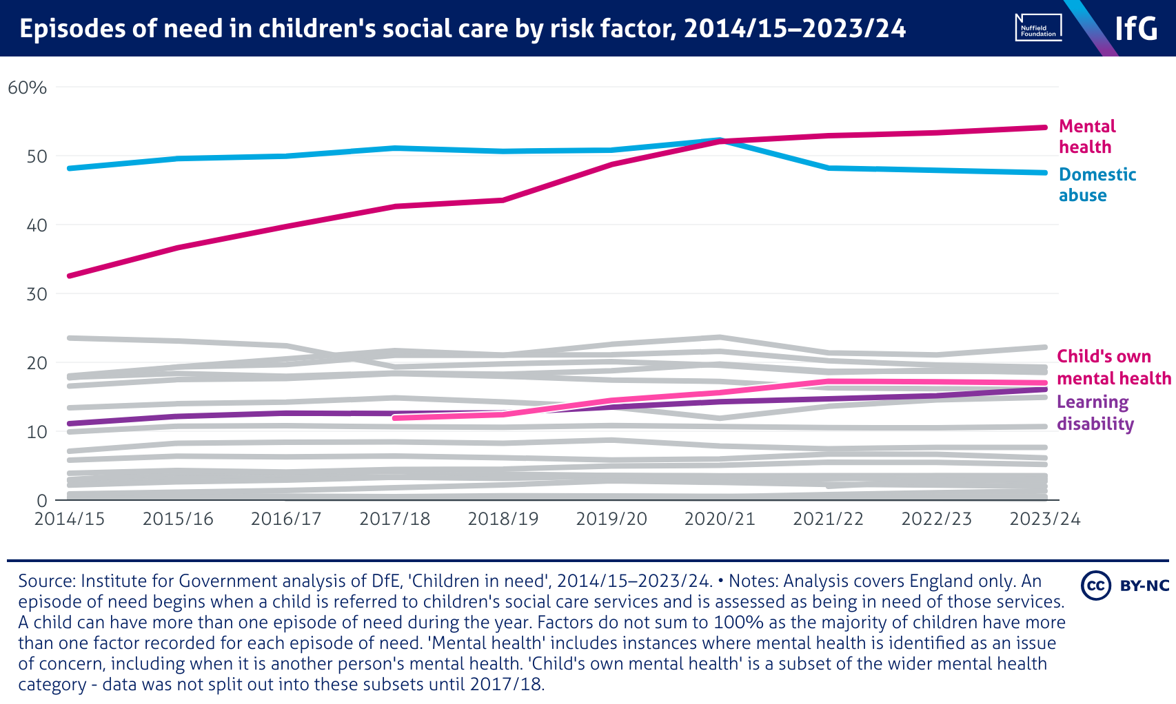 A line chart from the Institute for Government showing episodes of need in children's social care by risk factor, 2014/15–2023/24, where mental health has become the most common factor over time, domestic abuse has stayed consistently high, and child's own mental health and learning disabilities remain smaller but growing factors.