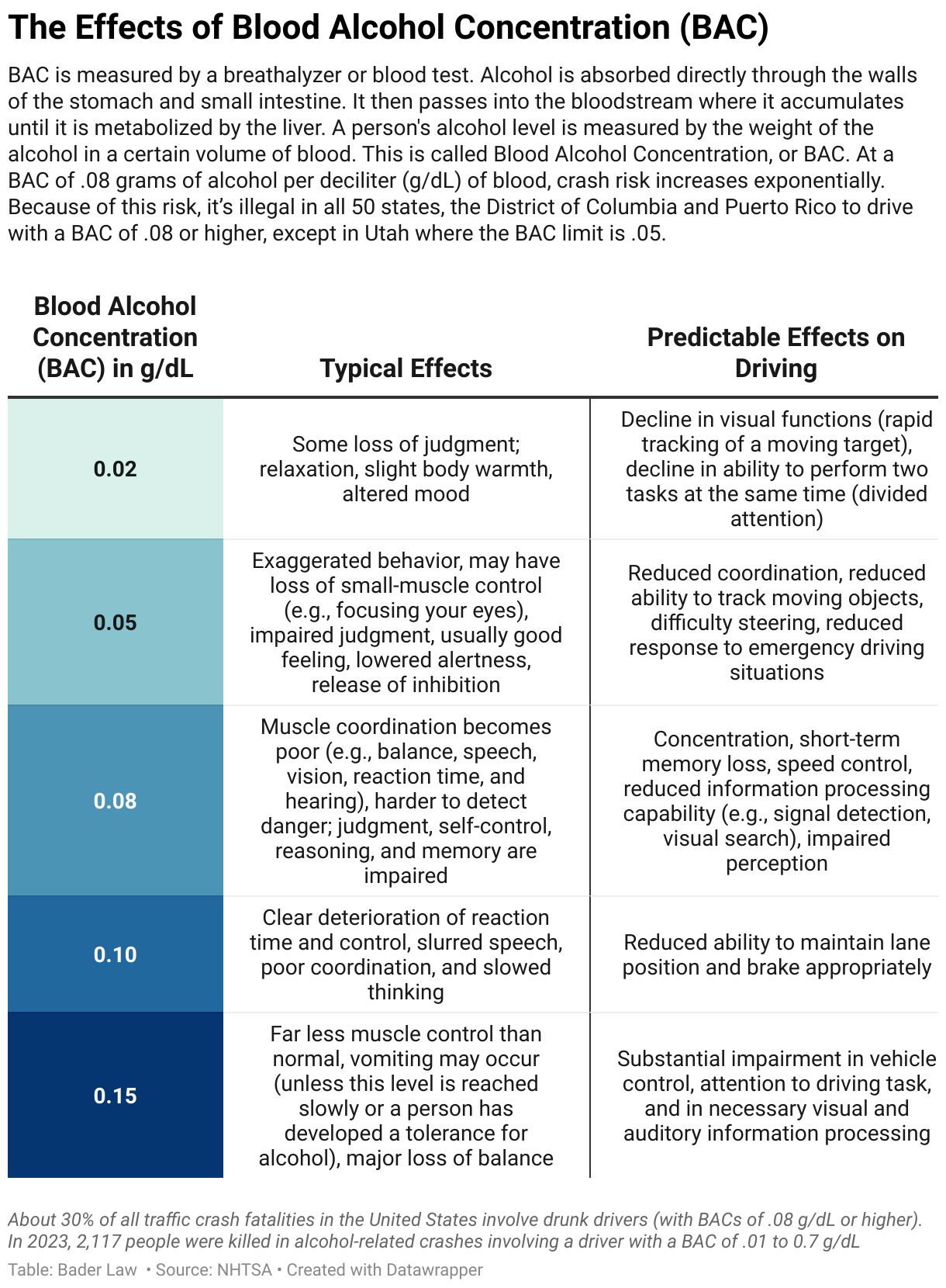 BAC is measured by a breathalyzer or blood test. Alcohol is absorbed directly through the walls of the stomach and small intestine. It then passes into the bloodstream where it accumulates until it is metabolized by the liver. A person's alcohol level is measured by the weight of the alcohol in a certain volume of blood. This is called Blood Alcohol Concentration, or BAC. At a BAC of .08 grams of alcohol per deciliter (g/dL) of blood, crash risk increases exponentially. Because of this risk, it’s illegal in all 50 states, the District of Columbia and Puerto Rico to drive with a BAC of .08 or higher, except in Utah where the BAC limit is .05.