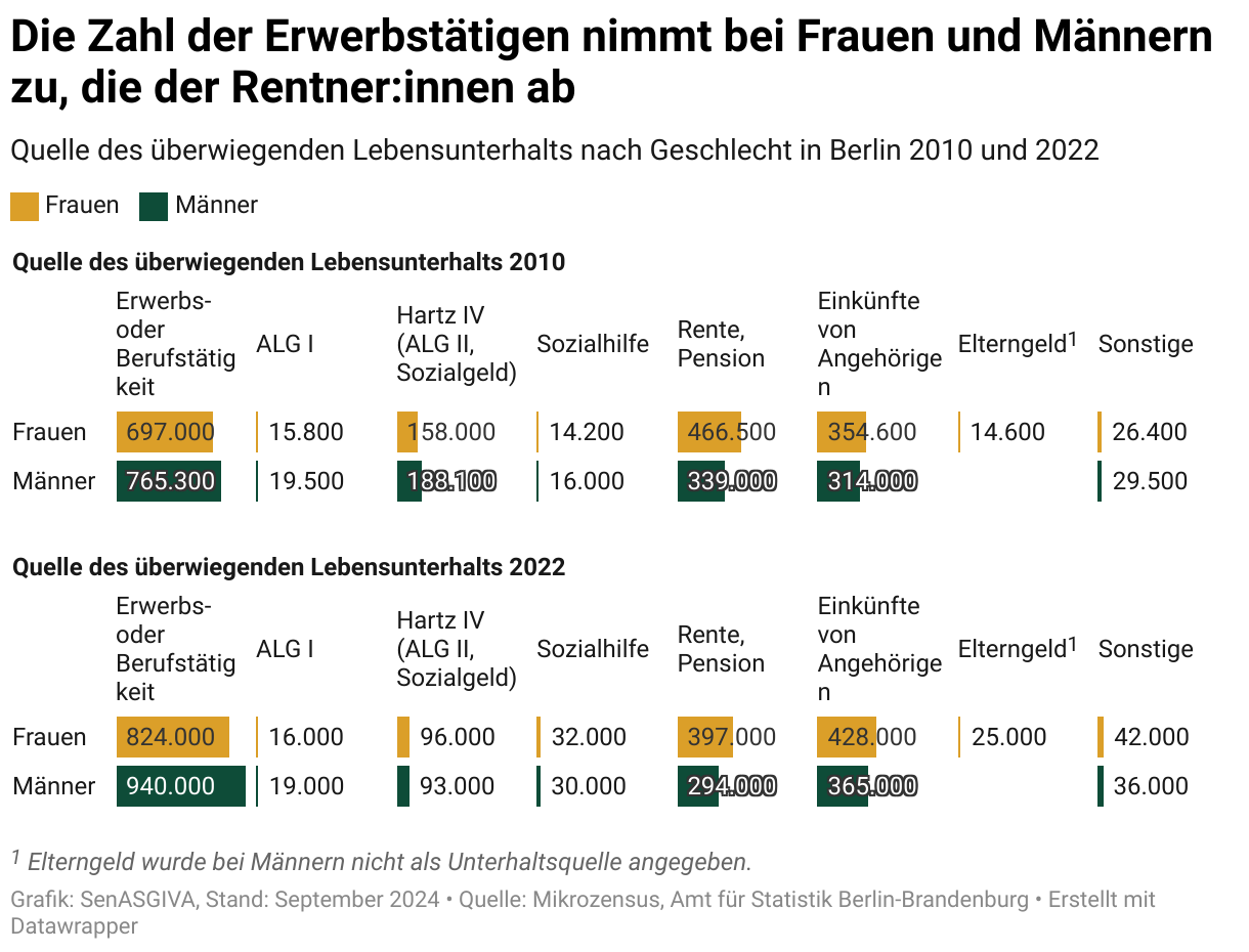 Im Vergleich zu 2010 bestritten im Jahr 2022 mehr Frauen und Männer ihren Haupt-Lebensunterhalt durch eine Erwerbs- oder Berufstätigkeit. Auch die Zahl der Personen, die durch ihre Angehörigen finanziert wurden, nahm bei beiden Geschlechtern zu. Die Zahlen derer, die sich hauptsächlich durch Renten bzw. Pensionen finanzieren sowie der Personen, die überwiegend von Hartz IV, ALG II und Sozialgeld leben, nahm hingegen ab.