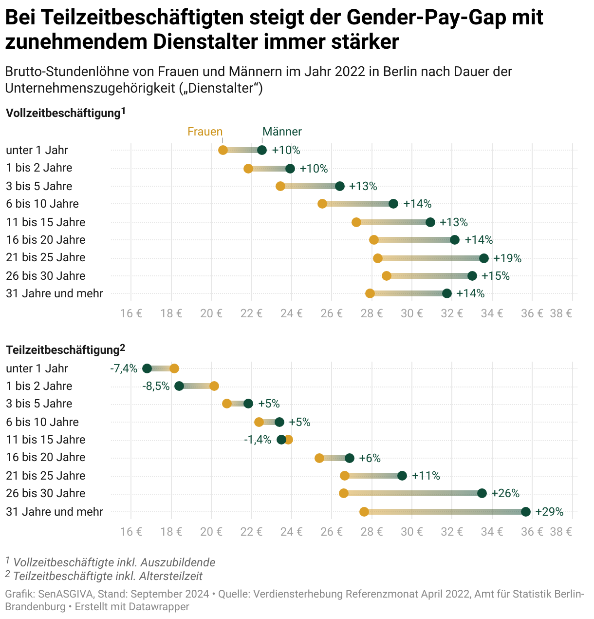 Bei den vollzeitbeschäftigten Berliner:innen steigt die Verdienstlücke von 10 Prozent mehr für die Männer bei Diensteintritt bis zu einem Mehrverdienst von 19 Prozent pro Stunde bei einem Dienstalter von 21 bis 25 Jahren. Danach sinken sowohl die Verdienste selbst als auch der Gender-Pay-Gap.