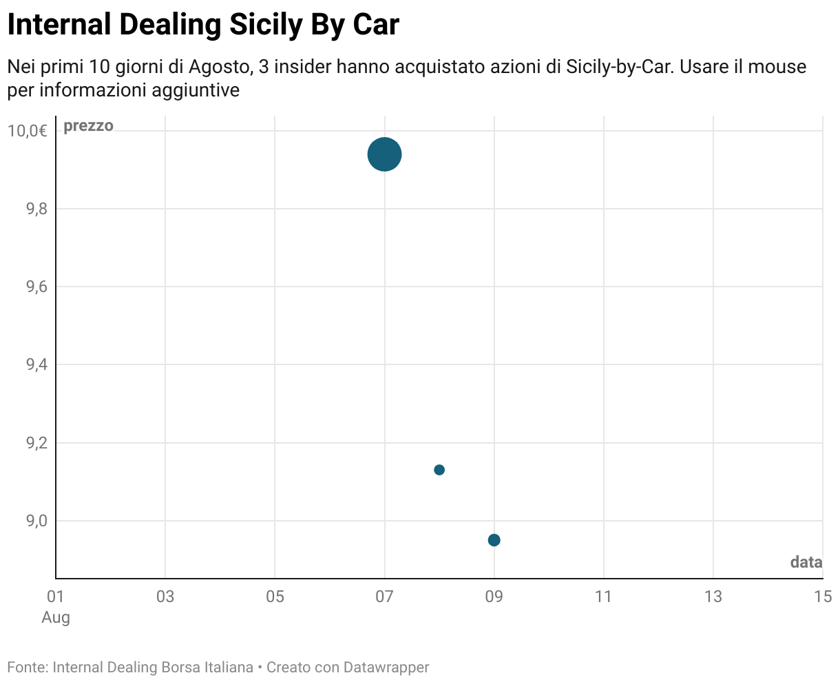 Nei primi 10 giorni di Agosto, 3 insider hanno acquistato azioni di Sicily-by-Car. Usare il mouse per informazioni aggiuntive