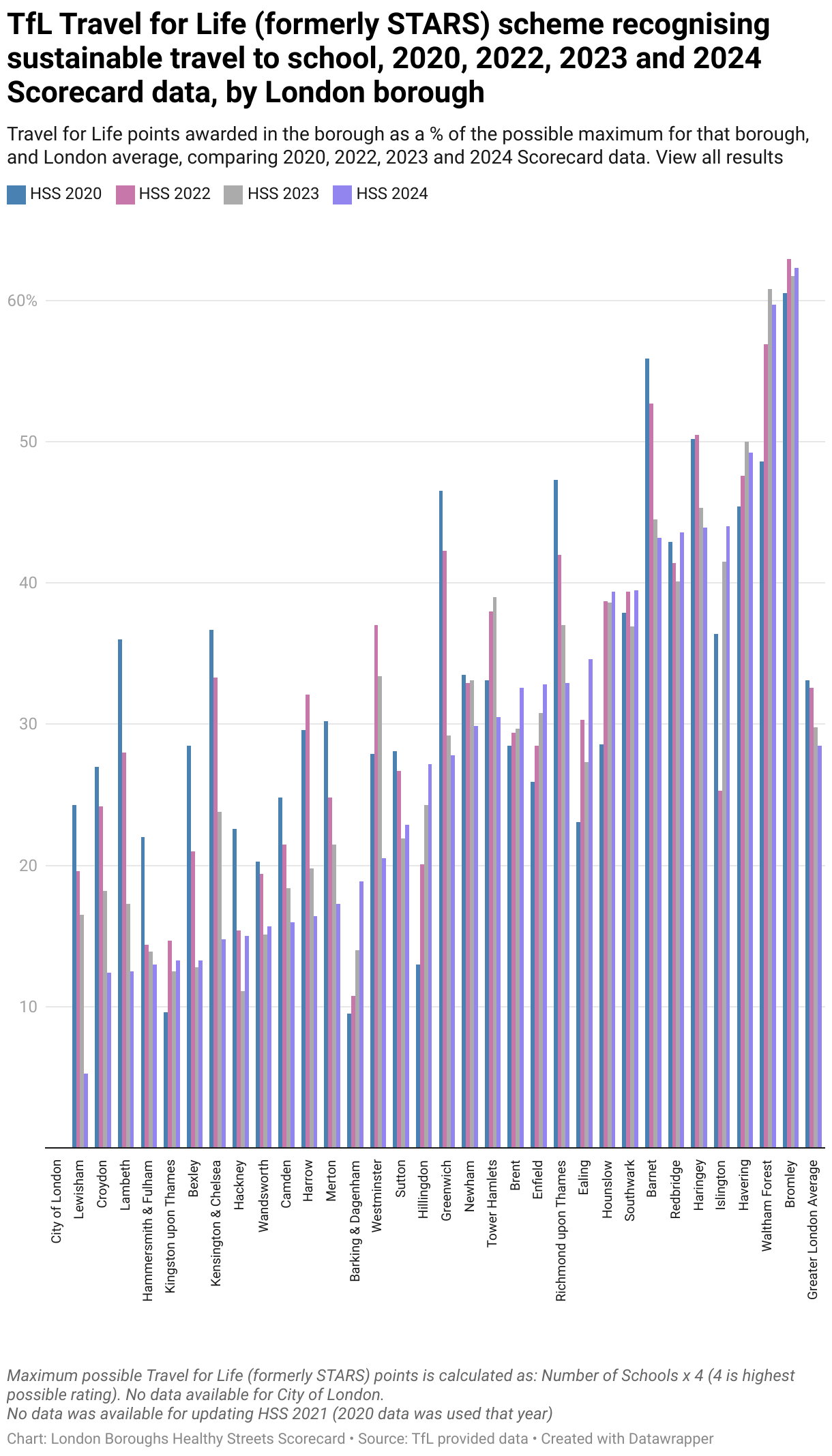 Travel for Life points awarded in the borough as a % of the possible maximum for that borough, and London average, comparing 2020, 2022, 2023 and 2024 Scorecard data. View all results