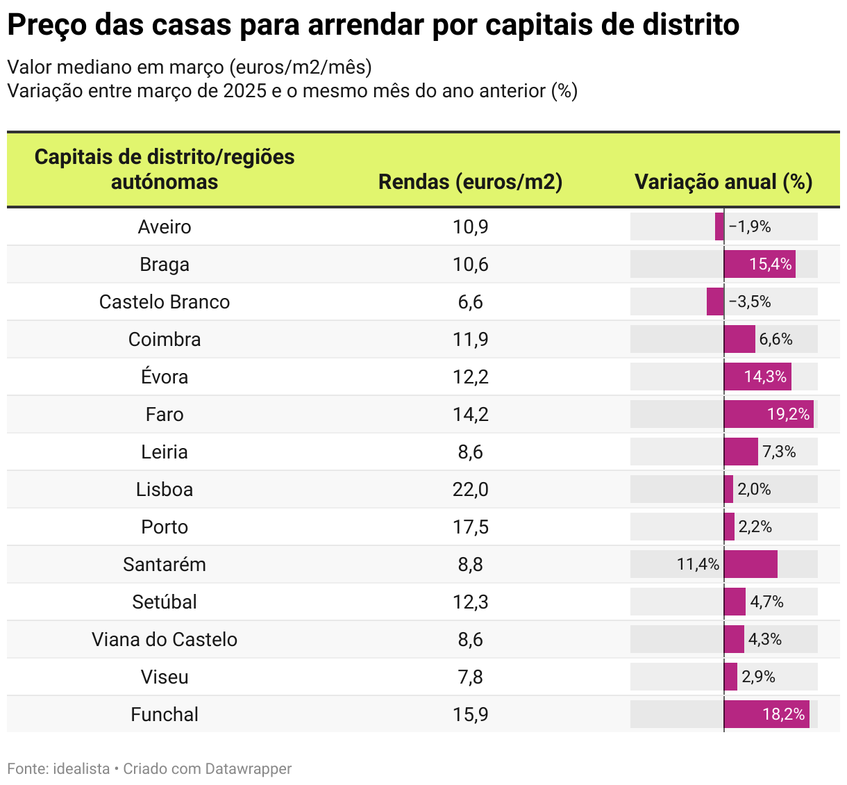 Valor mediano em março (euros/m2/mês) Variação entre março de 2025 e o mesmo mês do ano anterior (%)