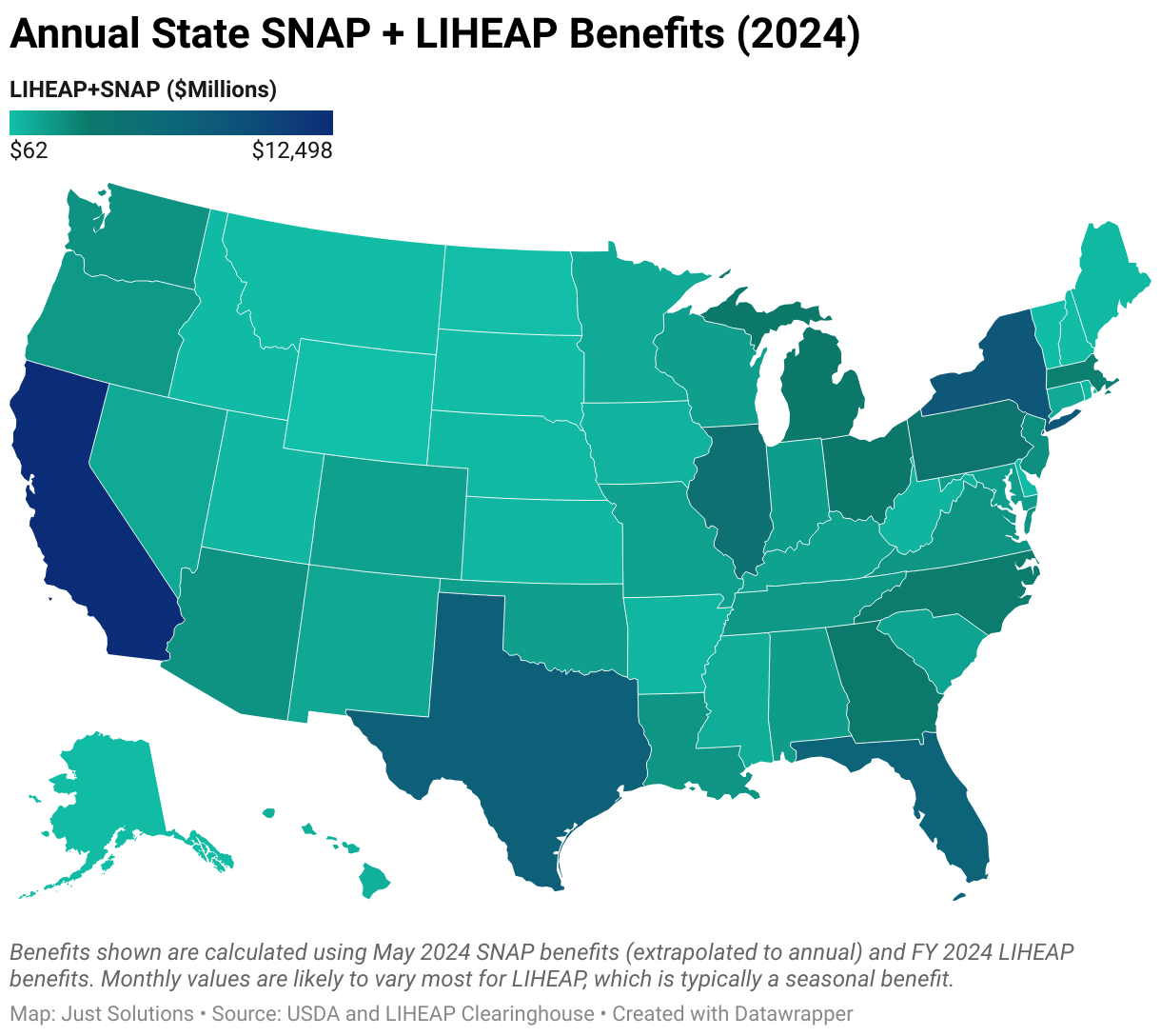 Annual combined LIHEAP and SNAP benefits for states range from $62 million in Wyoming to $12.5 billion in California.