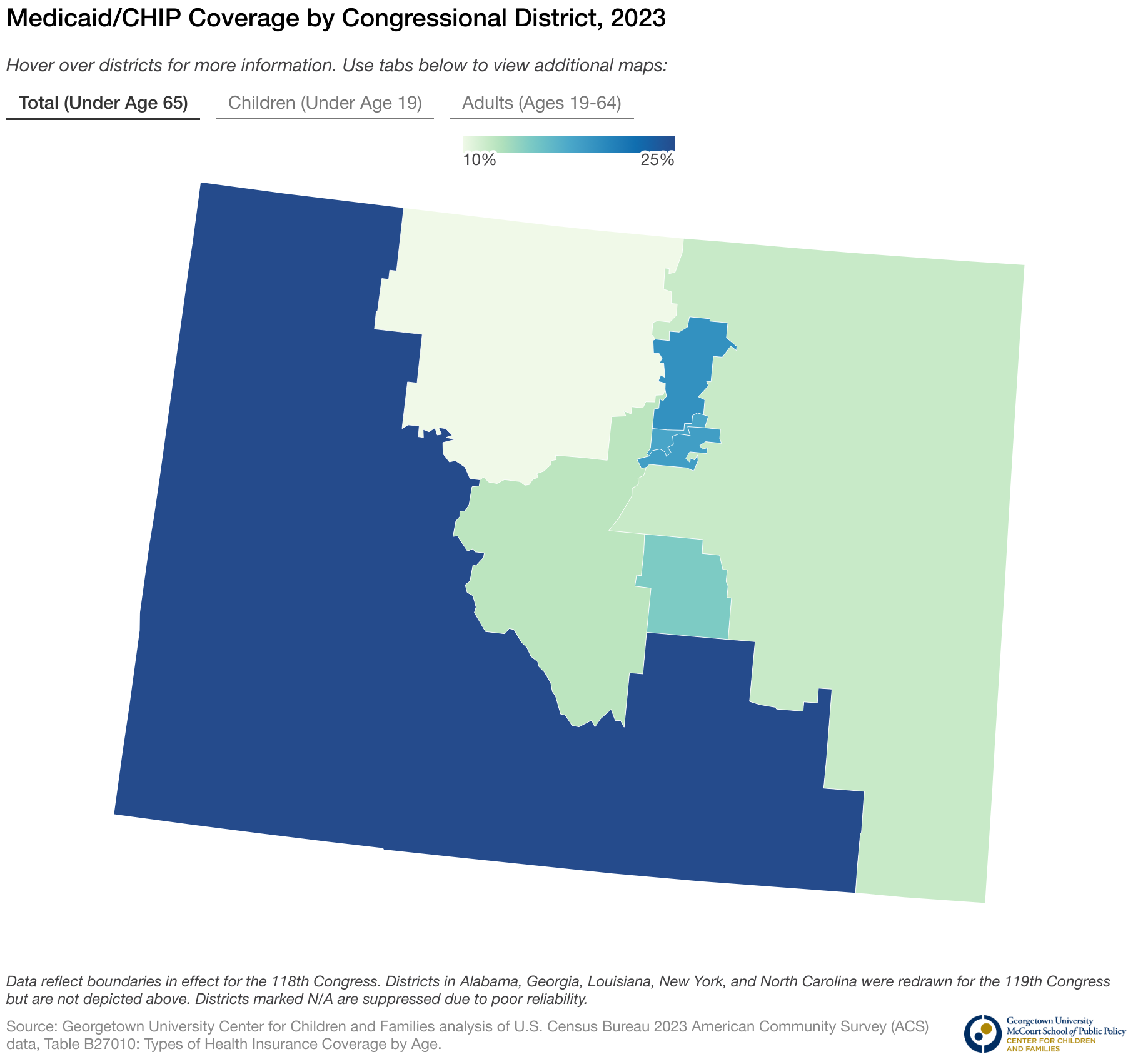 Hover over districts for more information. Use tabs below to view additional maps: Total (Under Age 65) Children (Under Age 19) Adults (Ages 19-64)