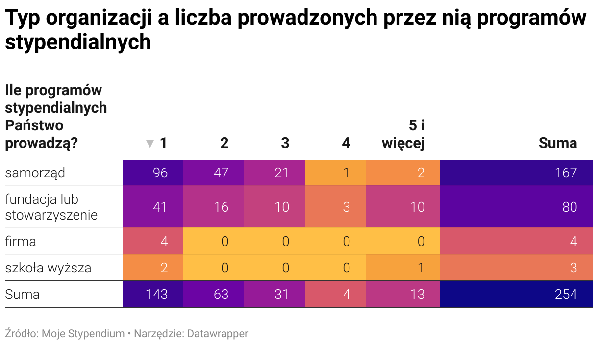 Typ organizacji a liczba prowadzonych przez nią programów stypendialnych