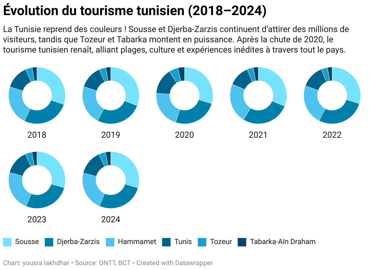 La Tunisie reprend des couleurs ! Sousse et Djerba-Zarzis continuent d’attirer des millions de visiteurs, tandis que Tozeur et Tabarka montent en puissance. Après la chute de 2020, le tourisme tunisien renaît, alliant plages, culture et expériences inédites à travers tout le pays.