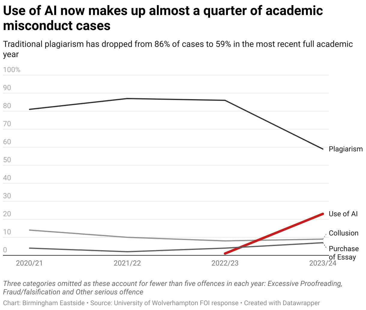 Traditional plagiarism has dropped from 86% of cases to 59% in the most recent full academic year