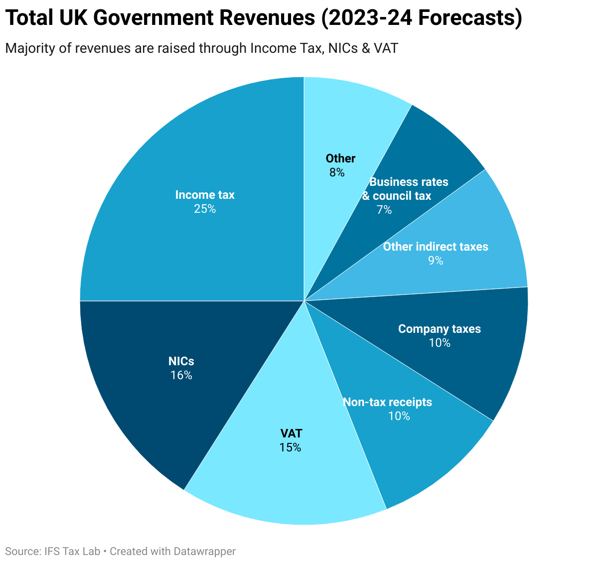 Majority of revenues are raised through Income Tax, NICs & VAT