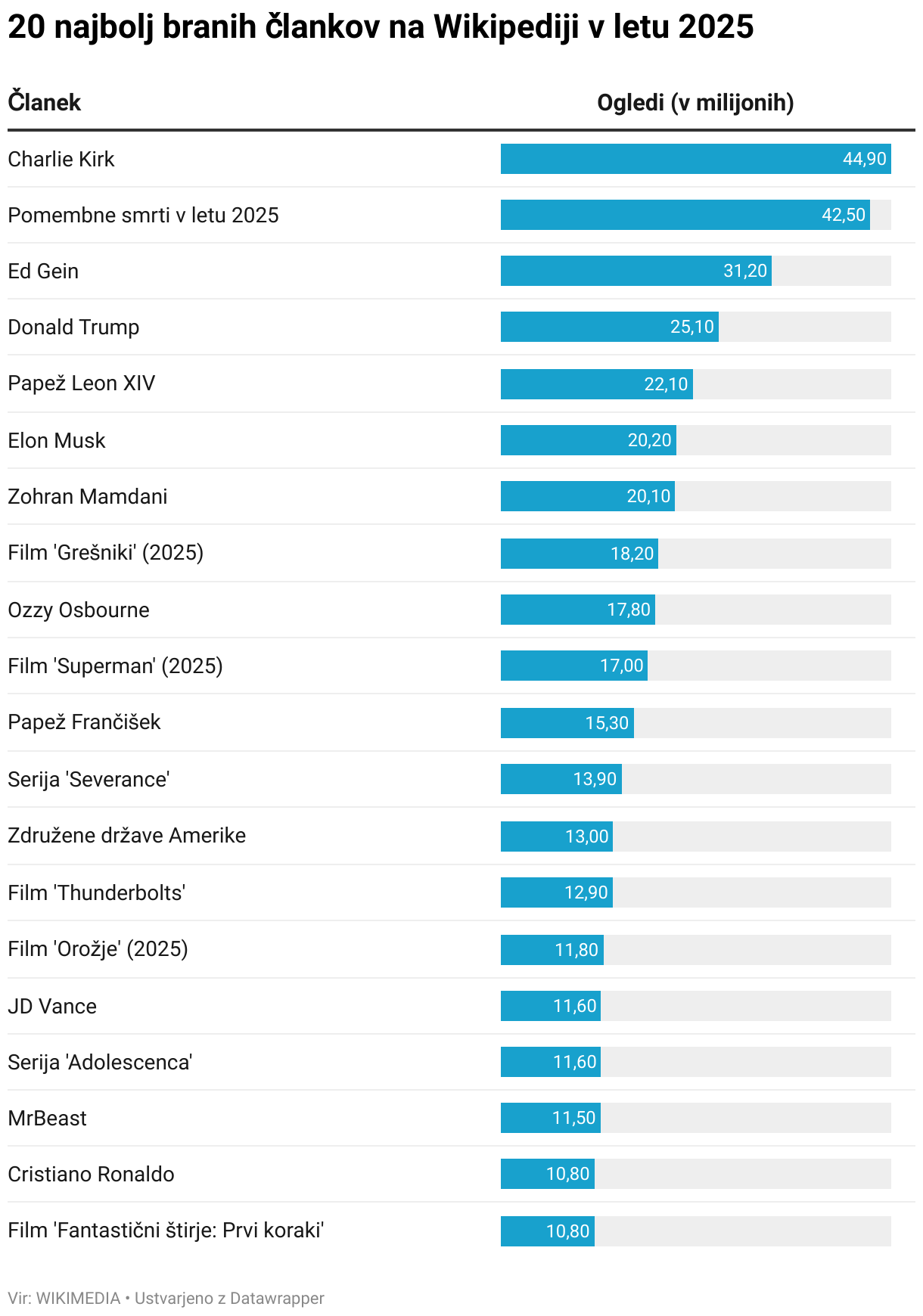 20 najbolj branih člankov na Wikipediji v letu 2025