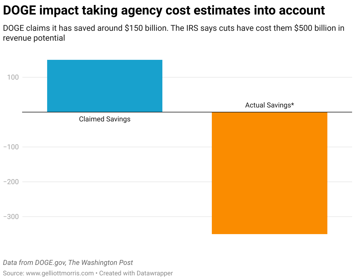 DOGE claims it has saved around $150 billion. The IRS says cuts have cost them $500 billion in revenue potential