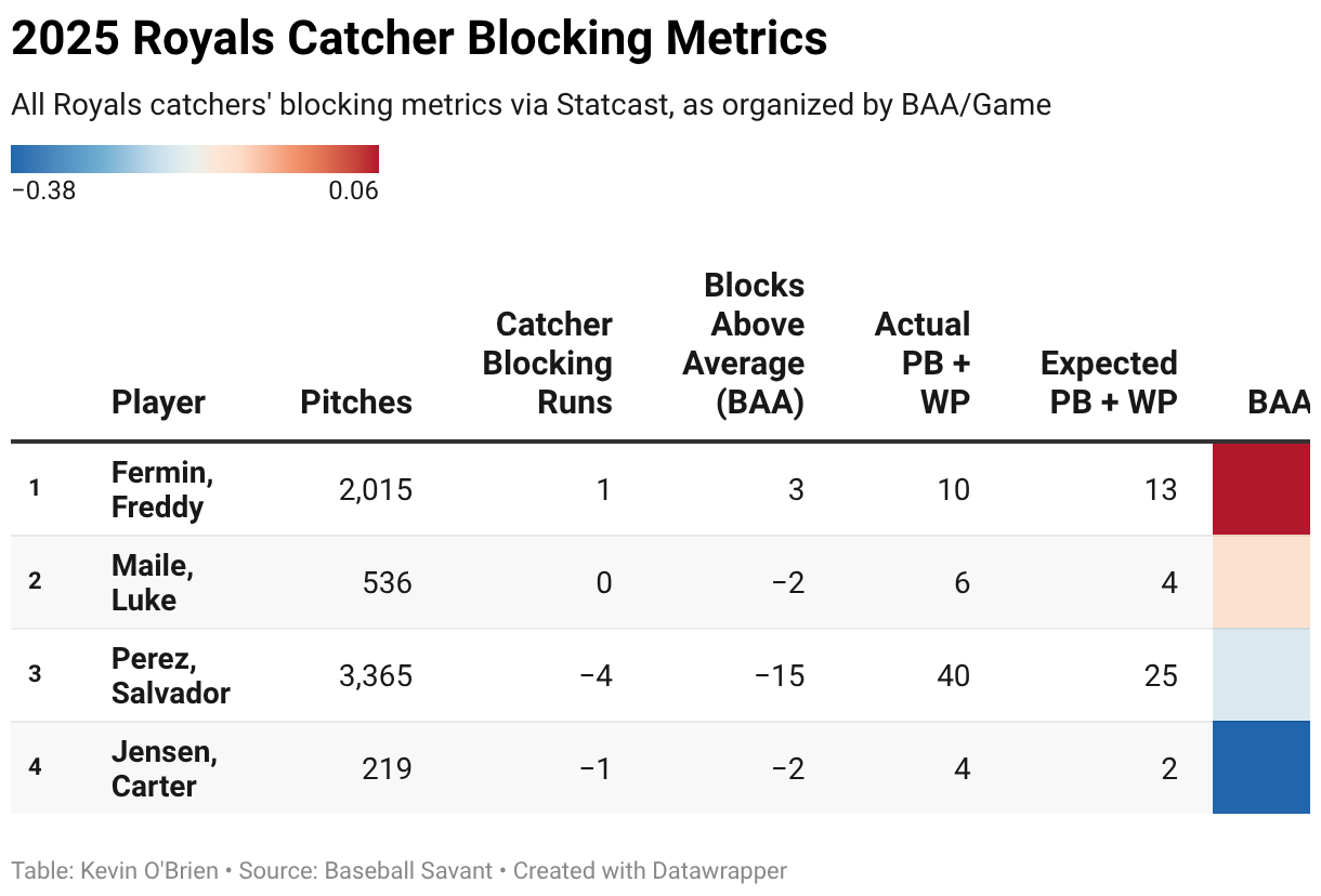 All Royals catchers' blocking metrics via Statcast, as organized by BAA/Game