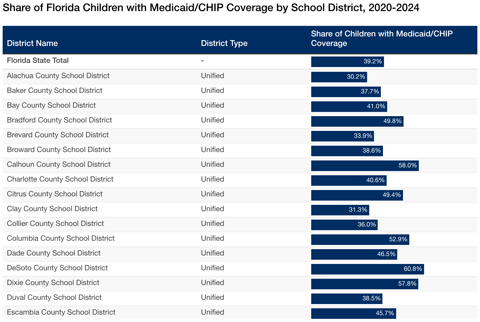 Share of Florida Children with Medicaid/CHIP Coverage by School District, 2020-2024