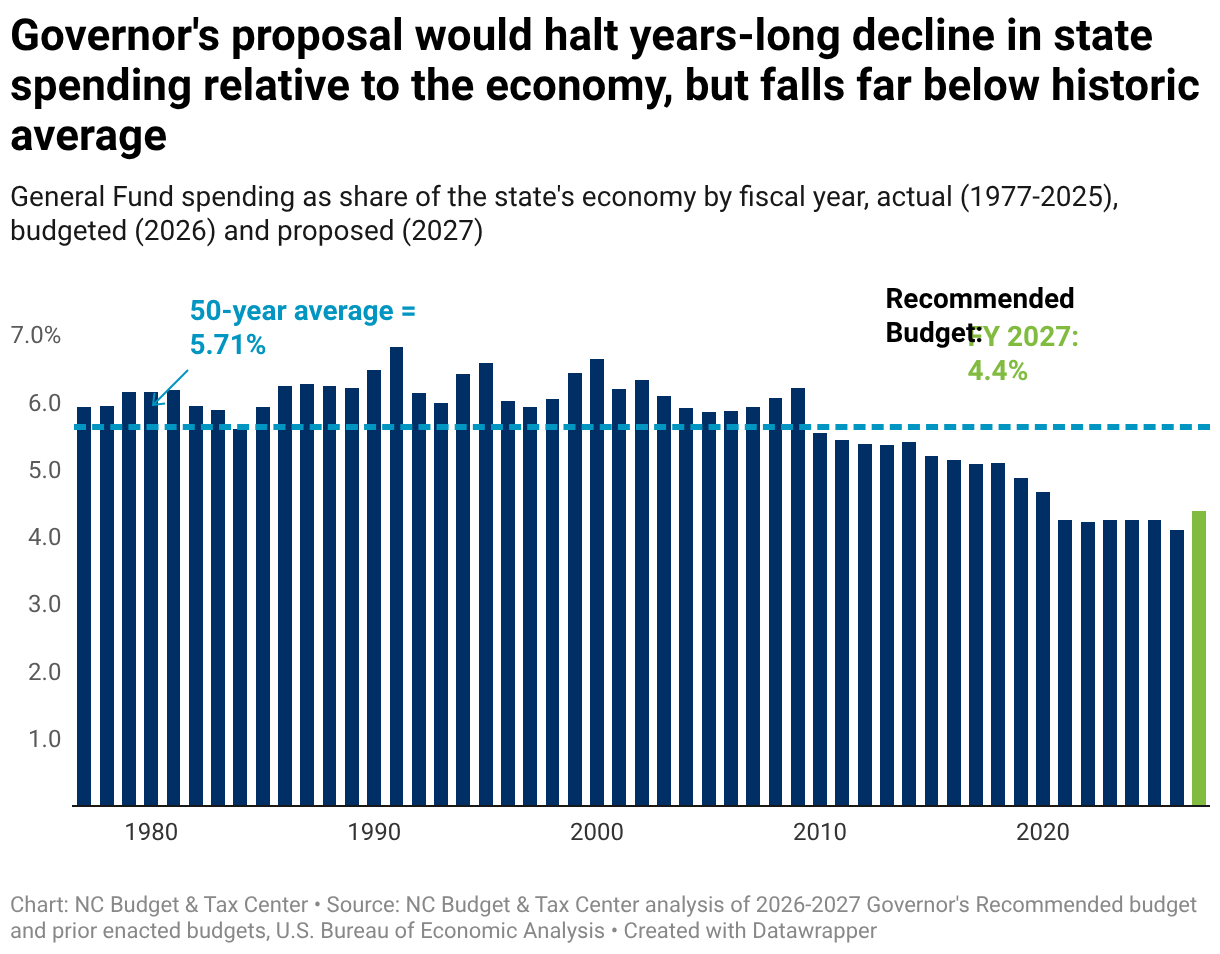 The chart shows 50 years of North Carolina's budget spending as a share of the economy. The Governor's recommended budget for 2025-2026 budget spending totals represents 4.52 percent of the state’s economy while the recommended budget for 2025-2027 represents 4.45 percent of the economy.