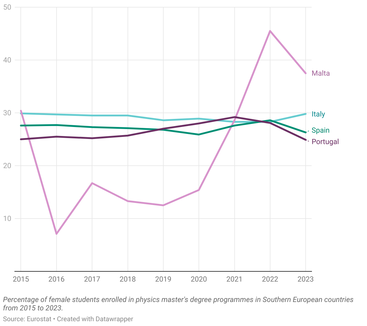 Percentage of female students enrolled in physics master's degree programmes in Southern European countries from 2015 to 2023.