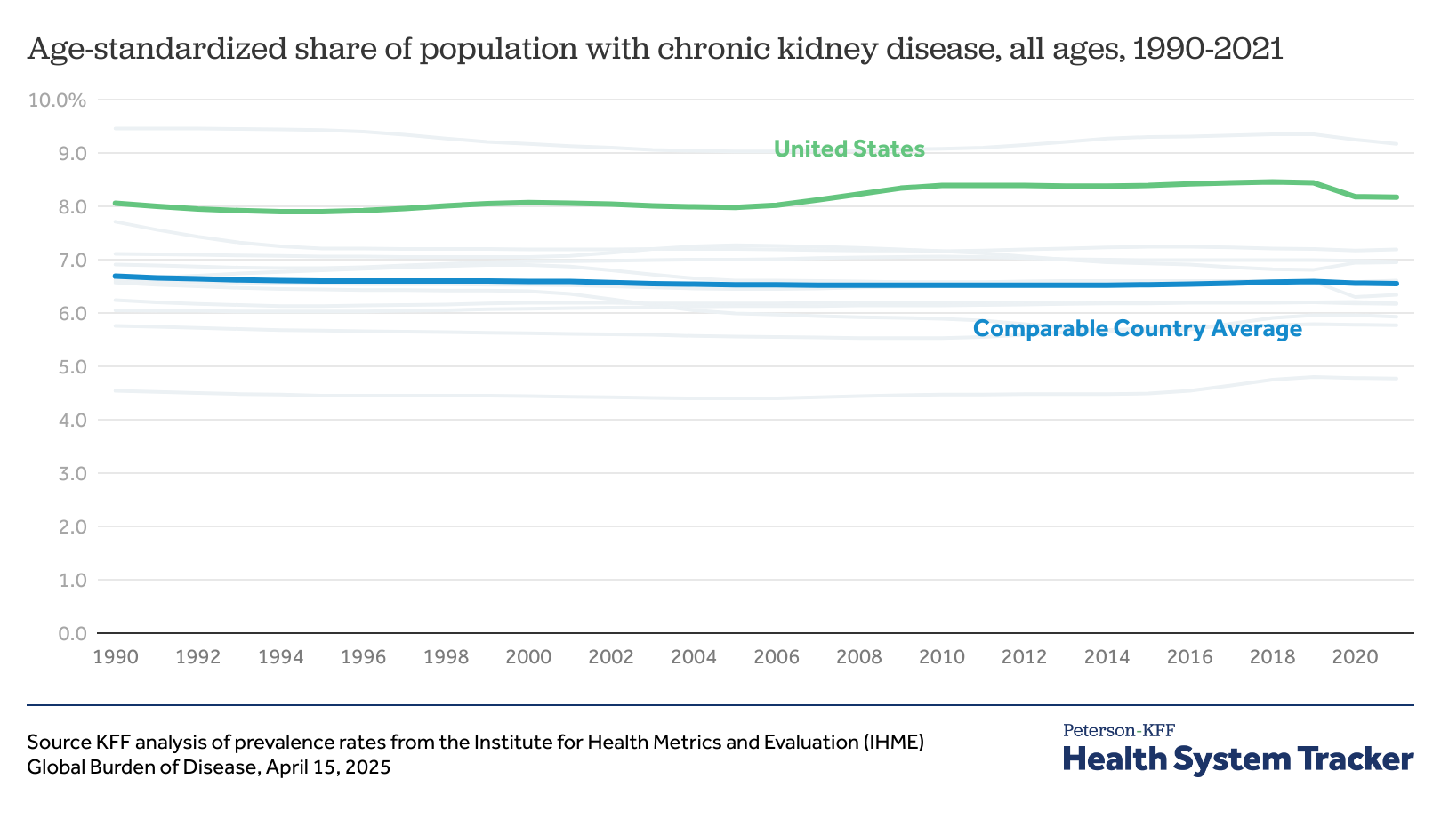Age-standardized share of population with chronic kidney disease, all ages, 1990-2021