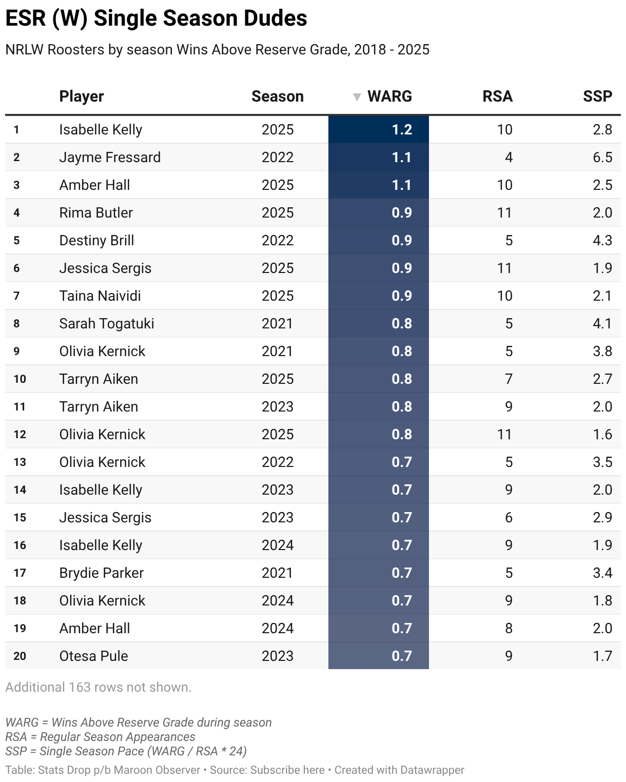 NRLW Roosters by season Wins Above Reserve Grade, 2018 - 2025