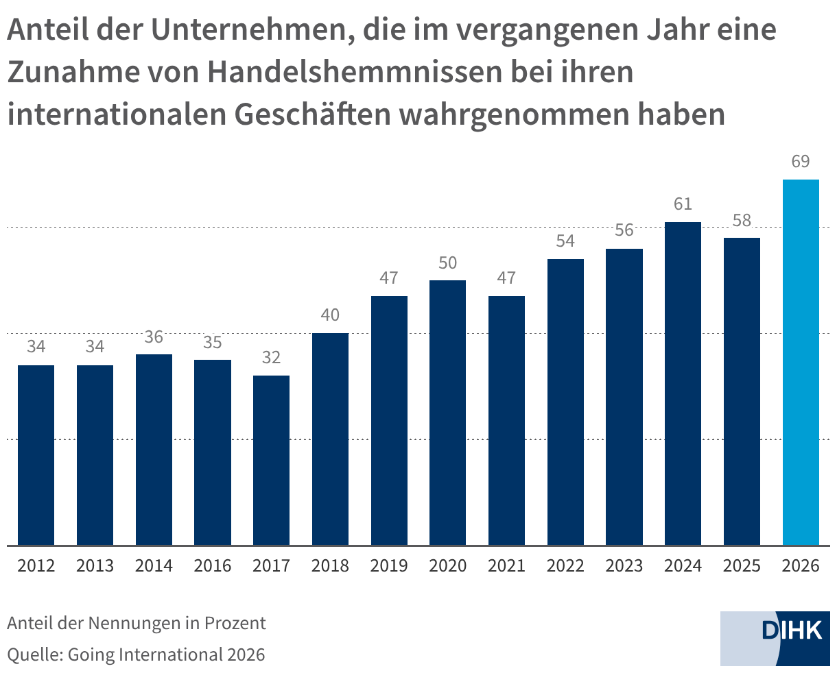 Anteil der Unternehmen, die im vergangenen Jahr eine Zunahme von Handelshemmnissen bei ihren internationalen Geschäften wahrgenommen haben