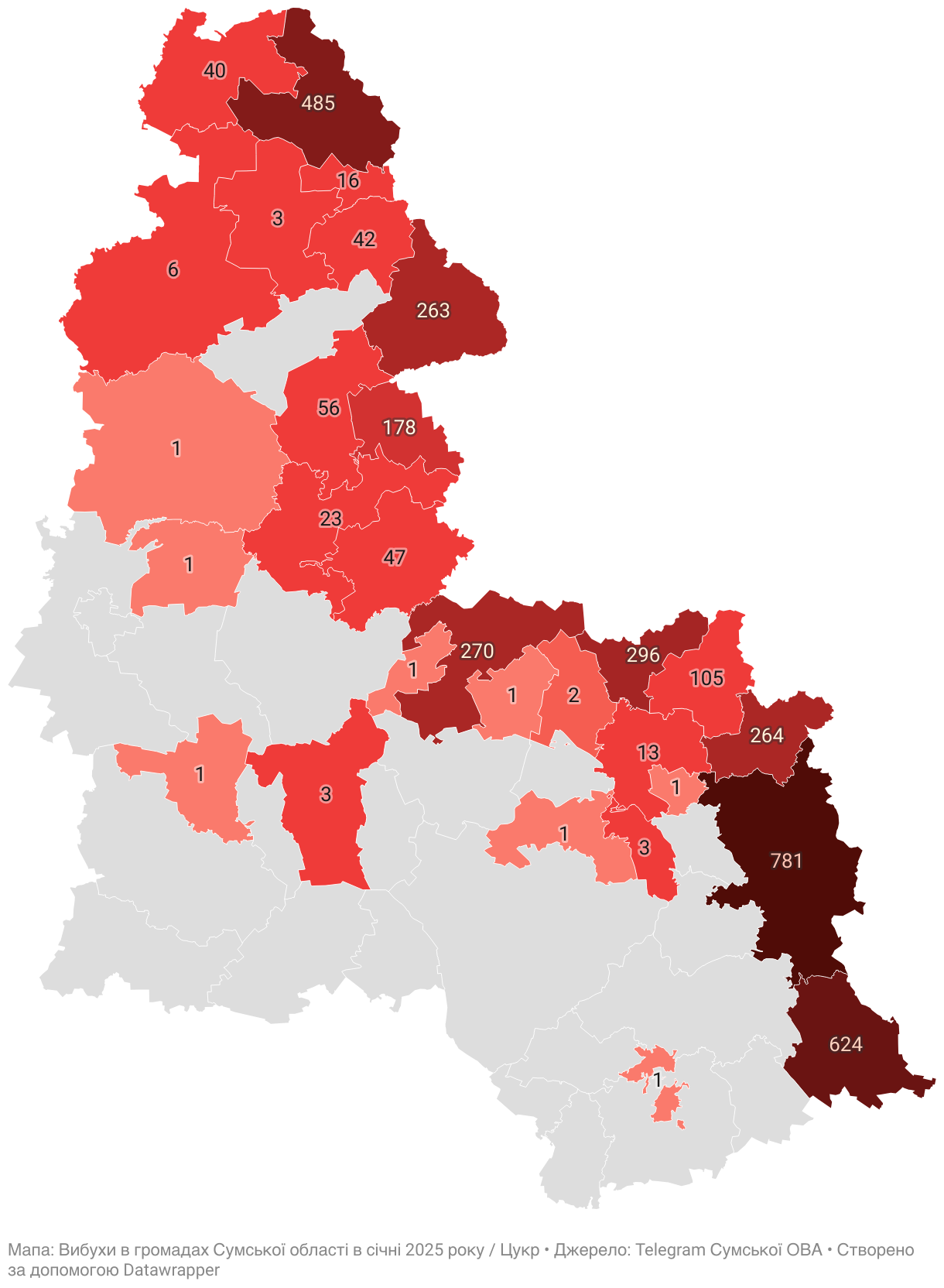 Діаграма: Вибухи в громадах Сумської області в січні 2025 року / ЦукрДжерело: Telegram Сумської ОВАЗавантажити зображенняСтворено за допомогою Datawrapper