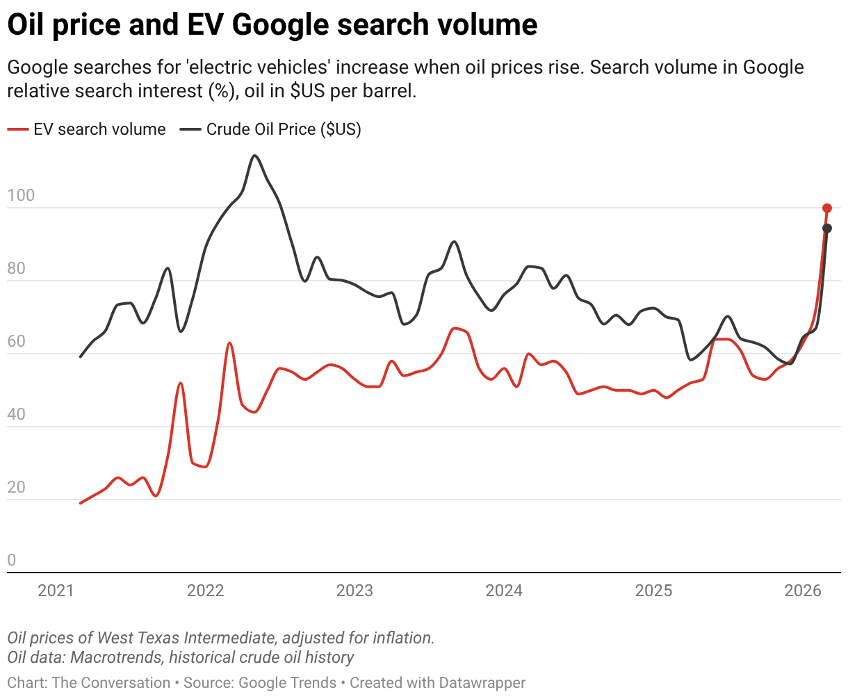 Google searches for 'electric vehicles' increase when oil prices rise. Search volume in Google relative search interest (%), oil in $US per barrel.
