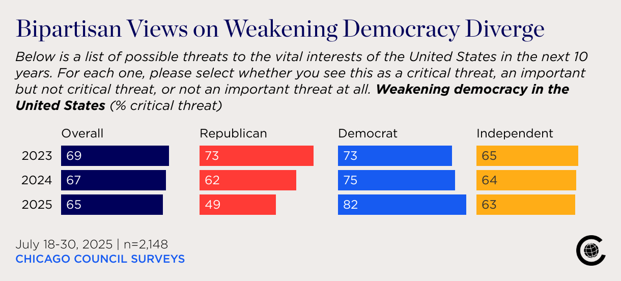 Below is a list of possible threats to the vital interests of the United States in the next 10 years. For each one, please select whether you see this as a critical threat, an important but not critical threat, or not an important threat at all. Weakening democracy in the United States (% critical threat)