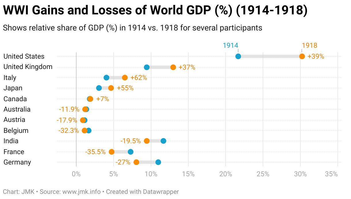 Shows relative share of GDP (%) in 1914 vs. 1918 for several participants