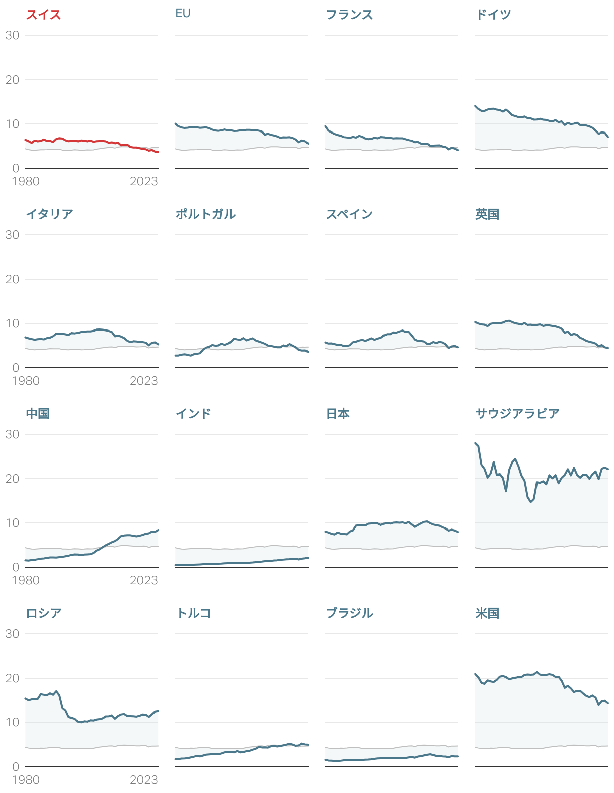 1人当たり年間CO₂排出量の推移、単位はトン。灰色の曲線は世界平均