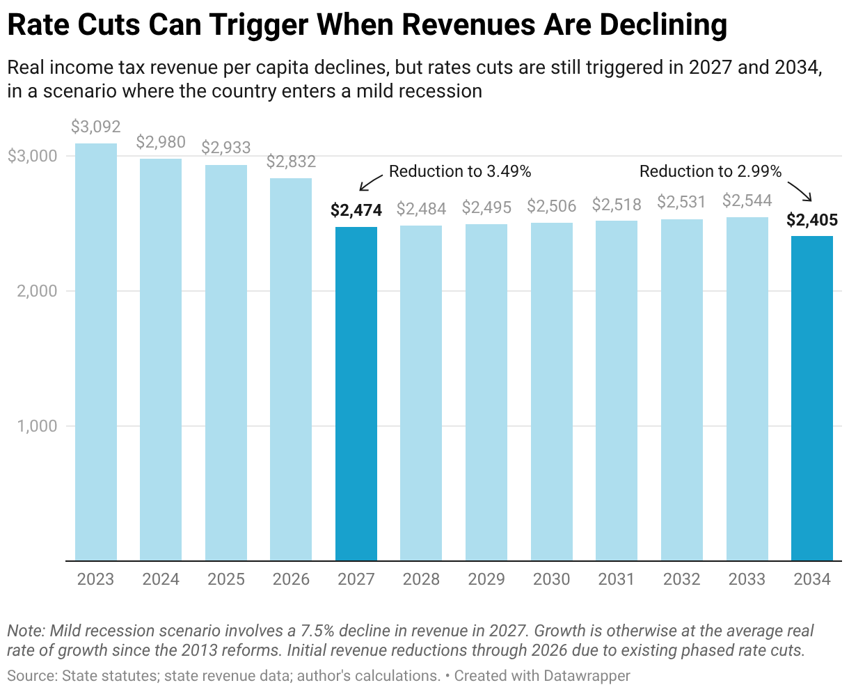 Real income tax revenue per capita declines, but rates cuts are still triggered in 2027 and 2034, in a scenario where the country enters a mild recession
