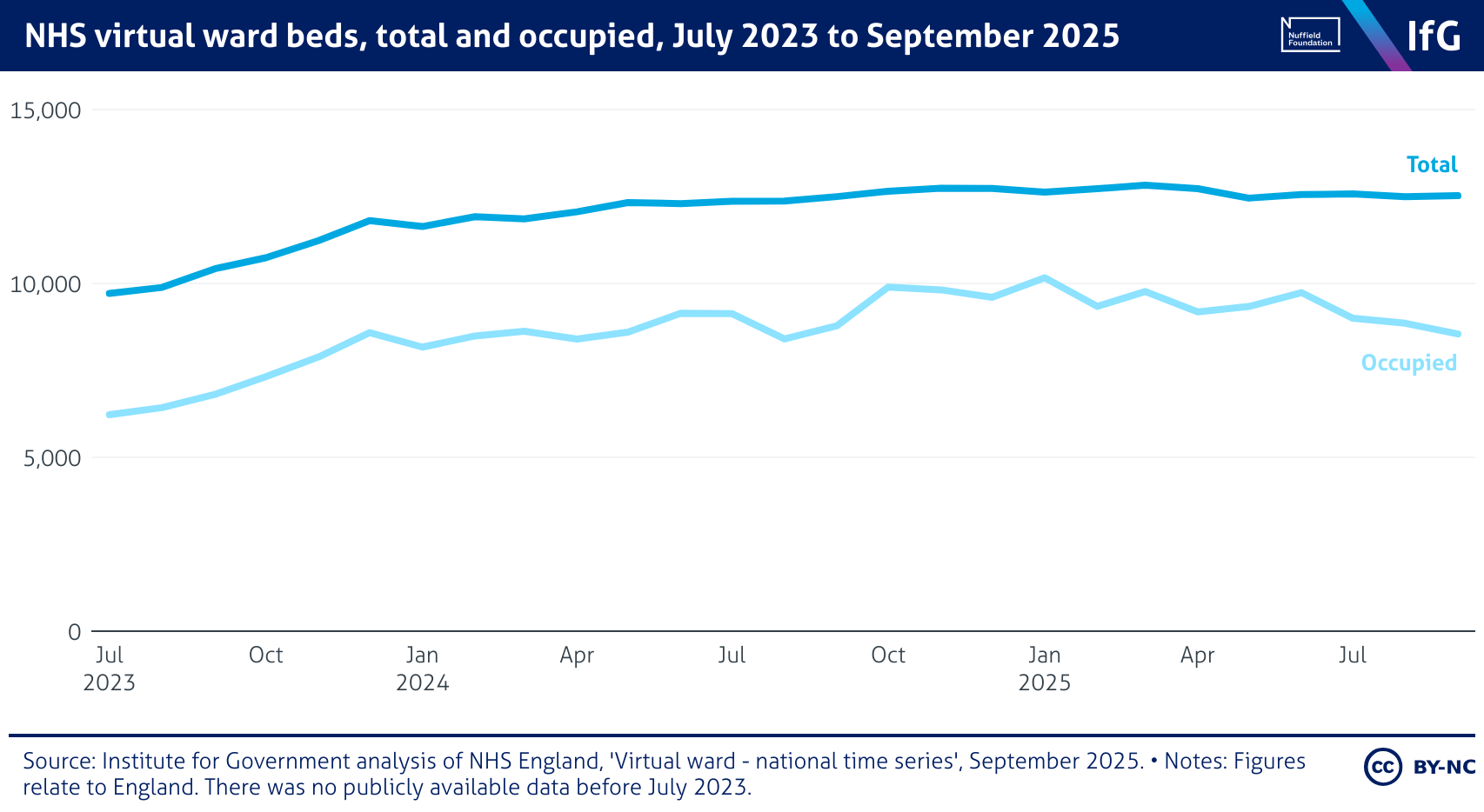 NHS virtual ward beds, total and occupied, July 2023 to September 2025
