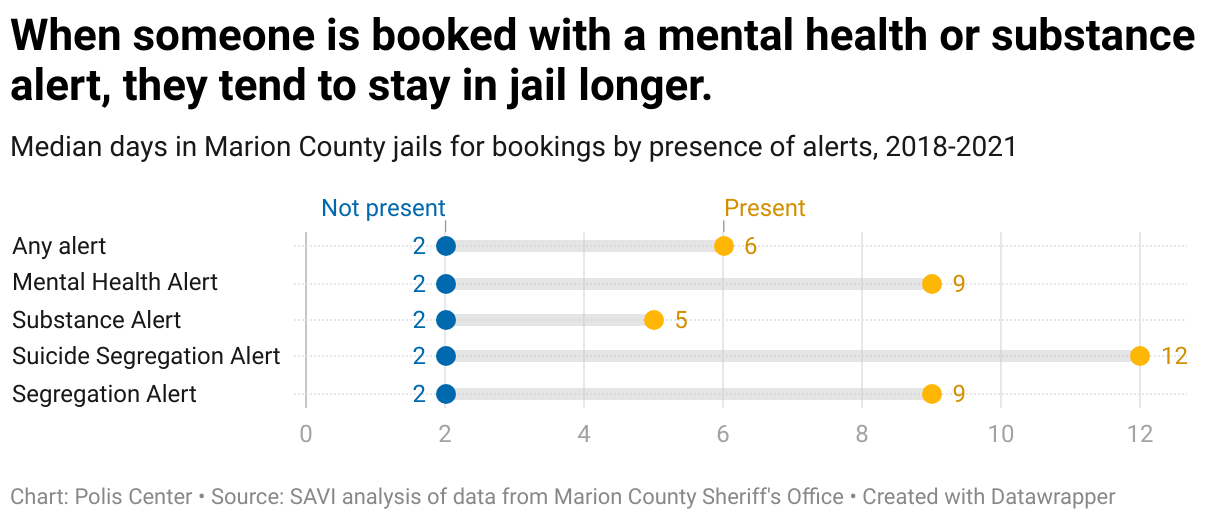 Median days in Marion County jails for bookings by presence of alerts, 2018-2021