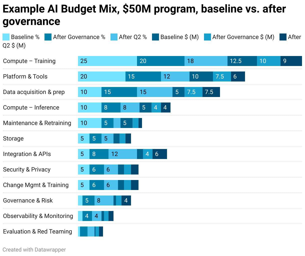 Example AI Budget Mix, $50M program, baseline vs. after governance
