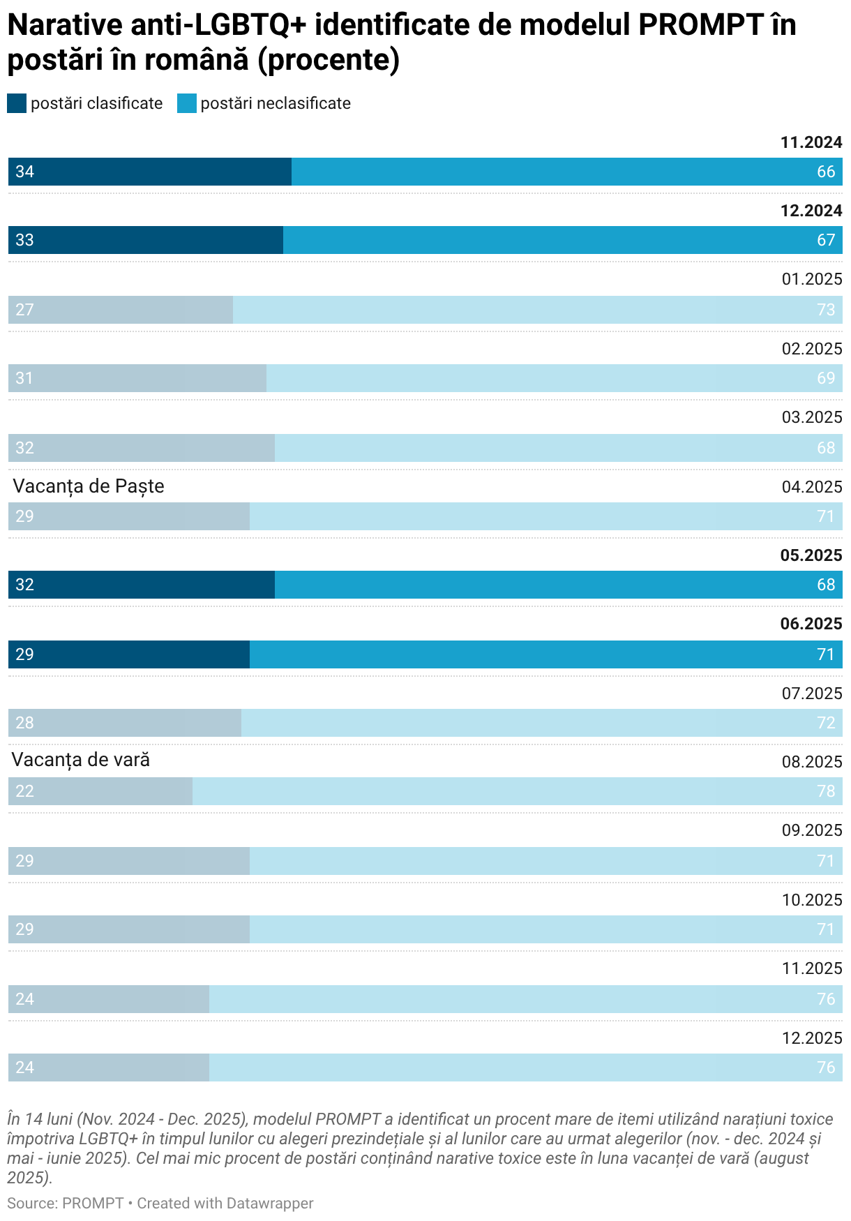 Graficul cuprinde procentele postărilor identificate de modelul PROMPT, pe o perioadă de 14 luni.