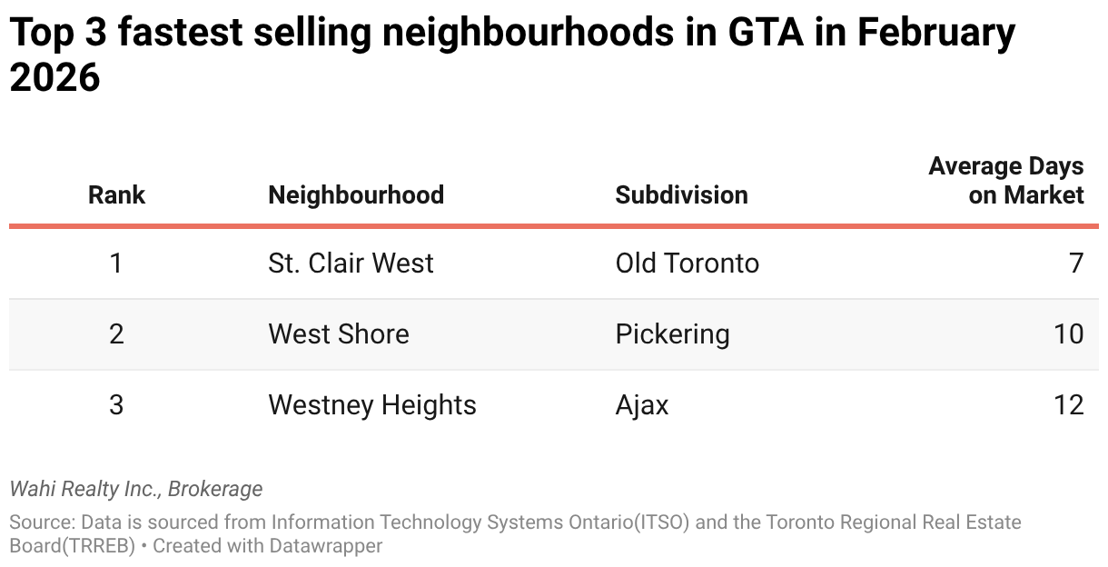 Top 3 fastest selling neighbourhoods in GTA in February 2026