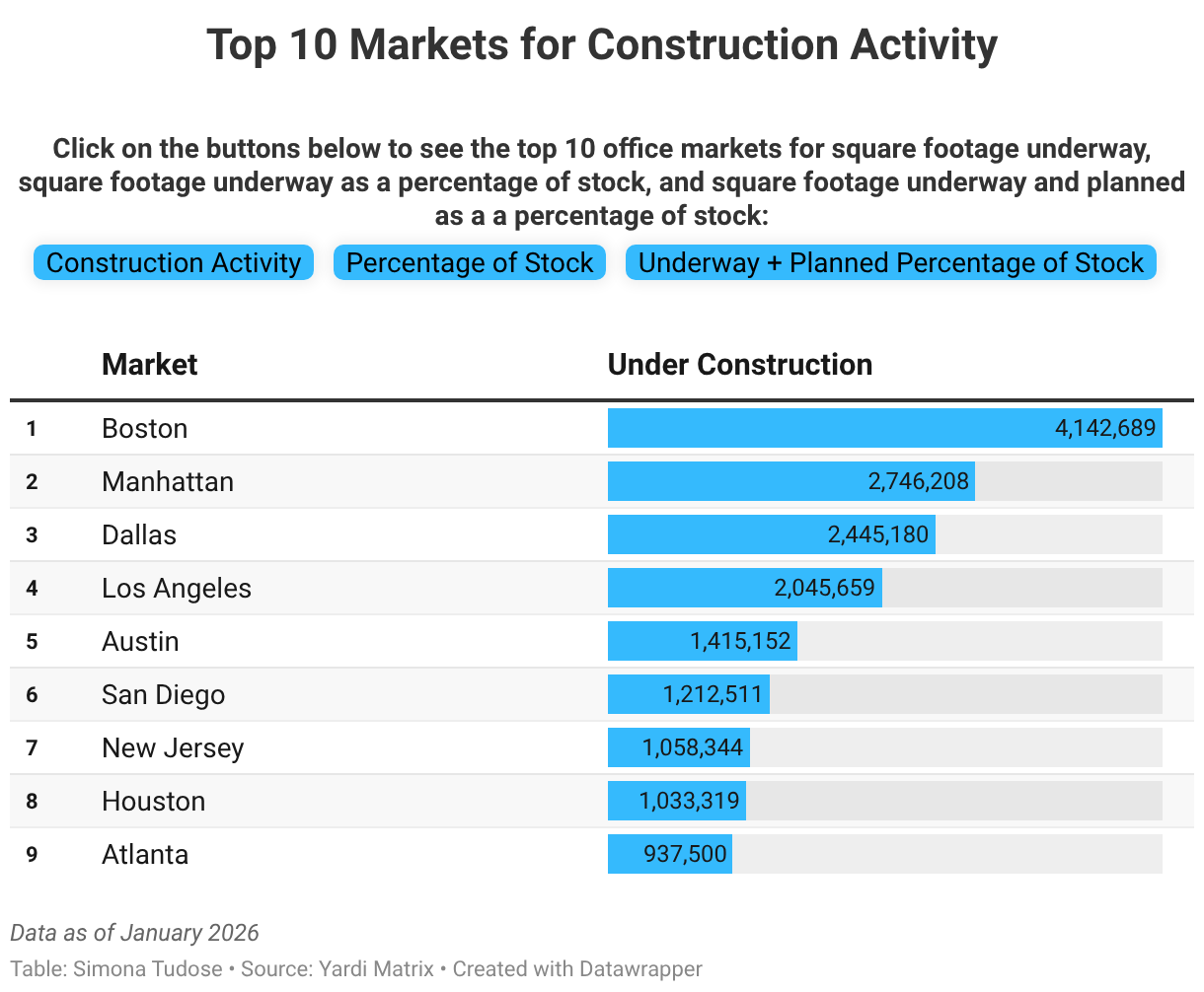 Click on the buttons below to see the top 10 office markets for square footage underway, square footage underway as a percentage of stock, and square footage underway and planned as a a percentage of stock: