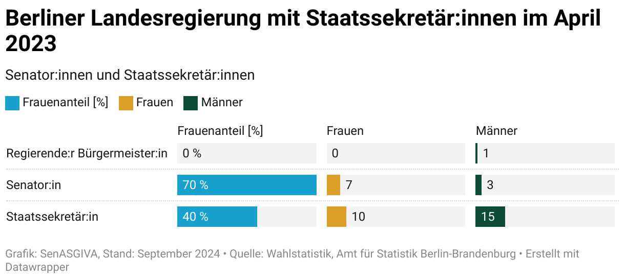 Der Frauenanteil der Landesregierung war im April 2023 fast ausgewogen. Berlin hatte in dieser Wahlperiode einen Bürgermeister und mit 7 Frauen mehr Senatorinnen als Senatoren (3). Darüber hinaus gab es 10 Staatssekretärinnen und 15 Staatssekretäre.
