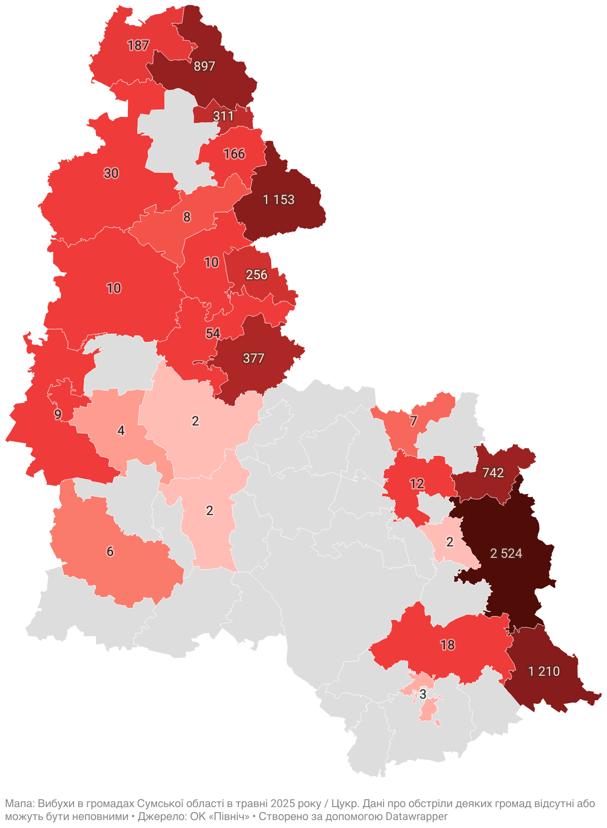Діаграма: Вибухи в громадах Сумської області в травні 2025 року / Цукр. Дані про обстріли деяких громад відсутні або можуть бути неповними Джерело: ОК «Північ» Вбудувати Завантажити зображення Створено за допомогою Datawrapper