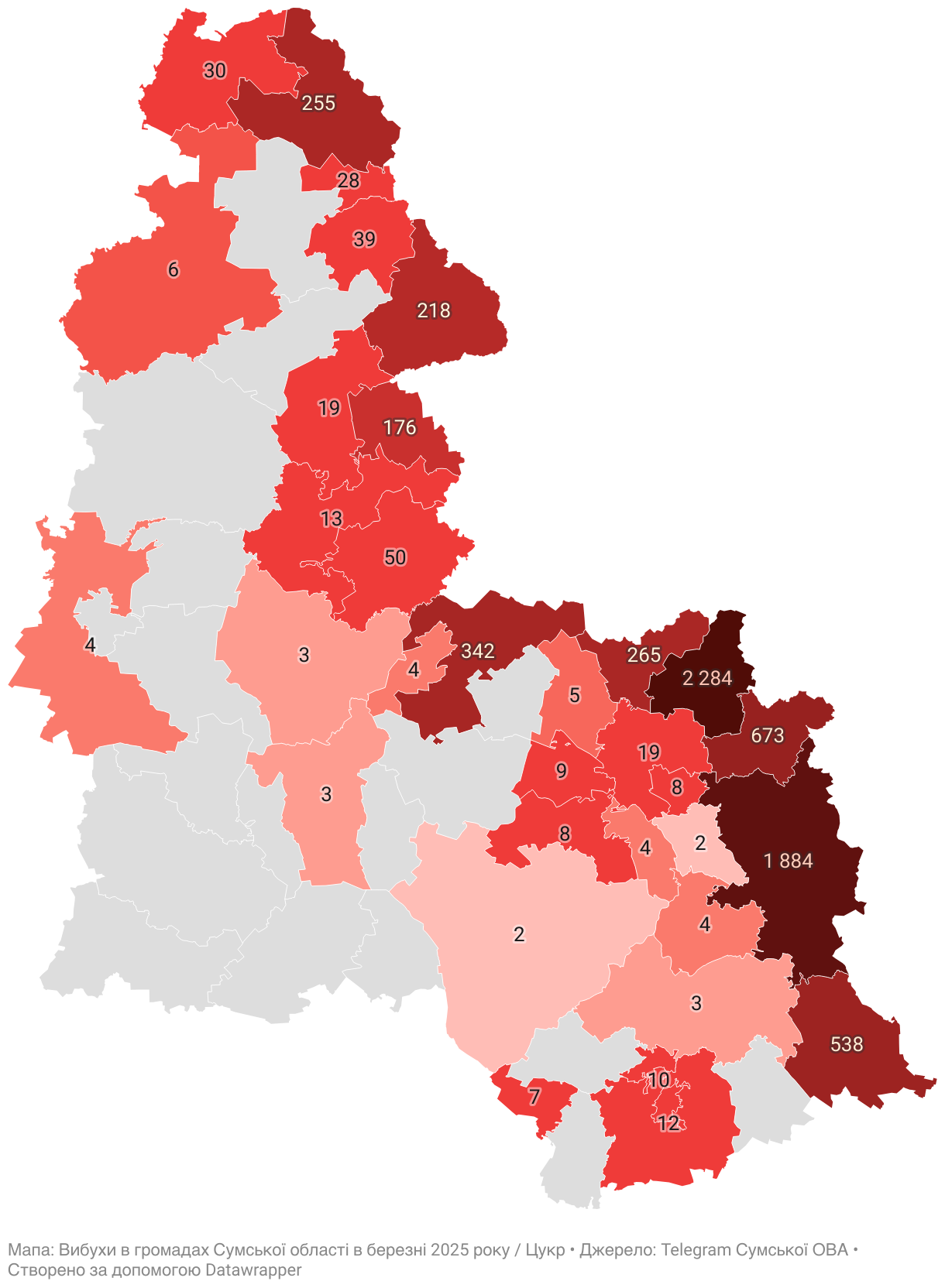 Діаграма: Вибухи в громадах Сумської області в березні 2025 року / ЦукрДжерело: Telegram Сумської ОВАВбудувати Завантажити зображенняСтворено за допомогою Datawrapper