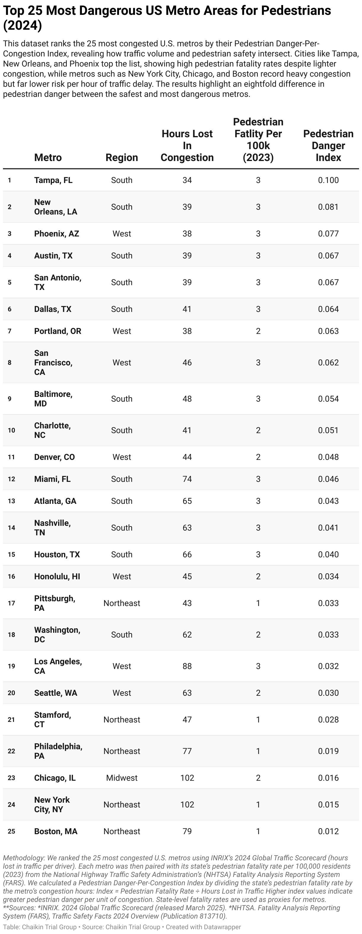 This dataset ranks the 25 most congested U.S. metros by their Pedestrian Danger-Per-Congestion Index, revealing how traffic volume and pedestrian safety intersect. Cities like Tampa, New Orleans, and Phoenix top the list, showing high pedestrian fatality rates despite lighter congestion, while metros such as New York City, Chicago, and Boston record heavy congestion but far lower risk per hour of traffic delay. The results highlight an eightfold difference in pedestrian danger between the safest and most dangerous metros.