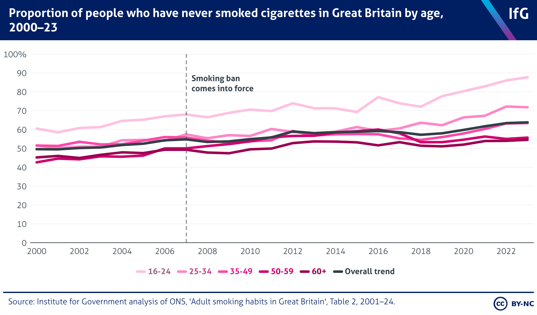 An Institute for Government line graph showing the proportion of people who have never smoked cigarettes in Great Britain by age, 2000-23, where the share of people who have never smoked has been steadily increasing over the entire period, reaching 63.8% of the total population in 2023, up from 49.6% in 2000.