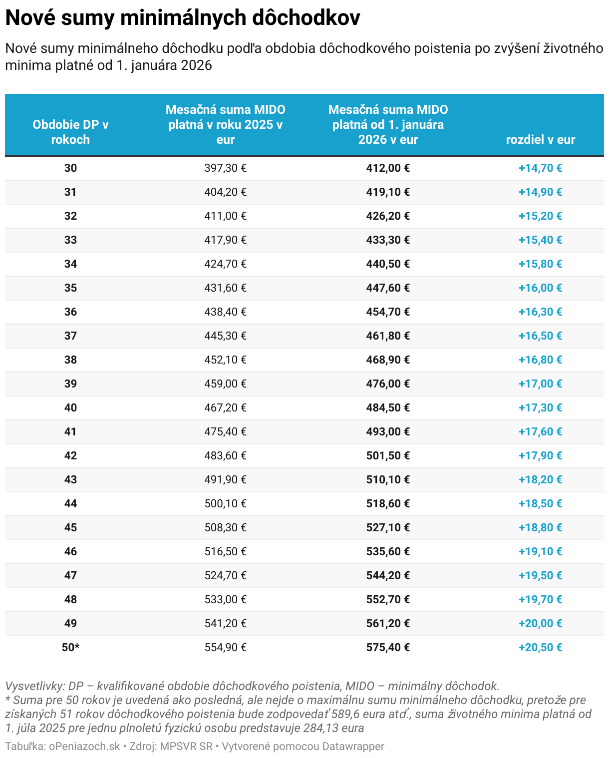 Nové sumy minimálneho dôchodku podľa obdobia dôchodkového poistenia po zvýšení životného minima platné od 1. januára 2026
