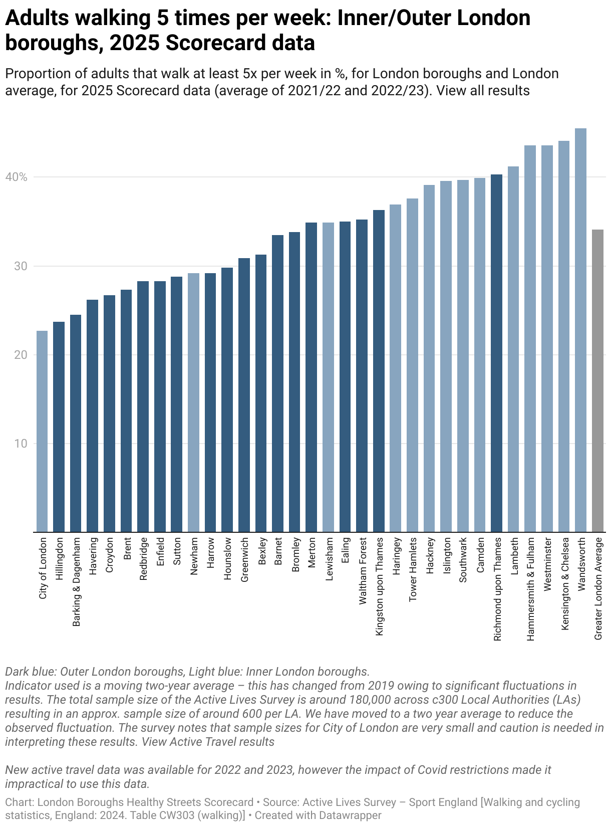 Adults walking 5 times per week: Inner/Outer London boroughs, 2025 Scorecard data