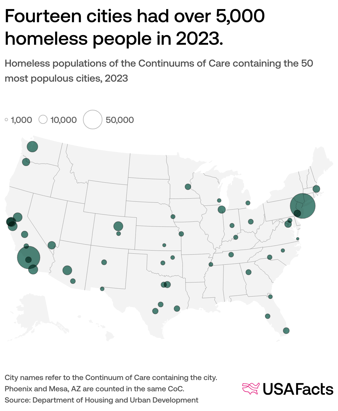 Homeless populations of the Continuums of Care containing the 50 most populous cities, 2023