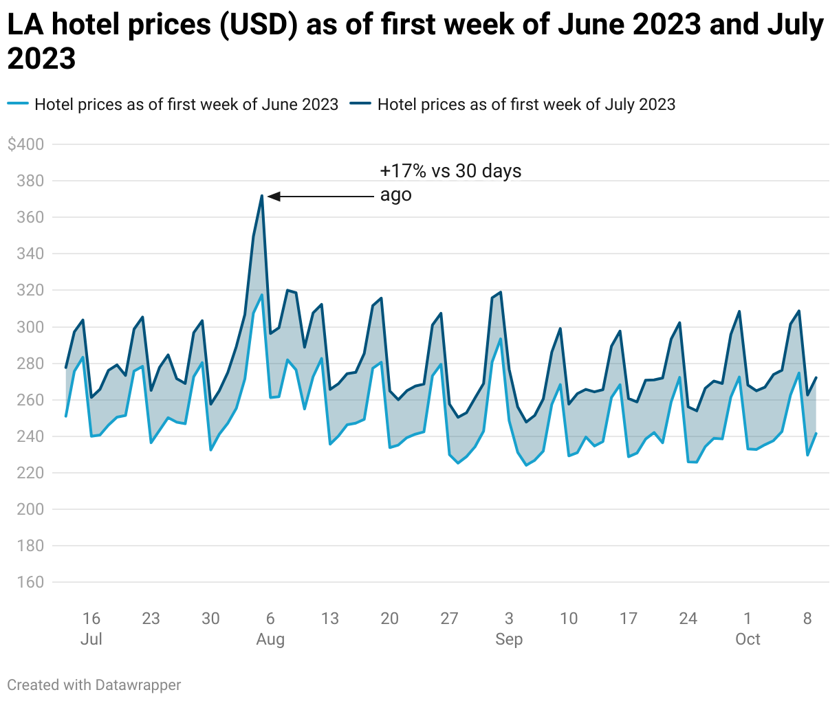 LA hotel prices (USD) as of first week of June 2023 and July 2023