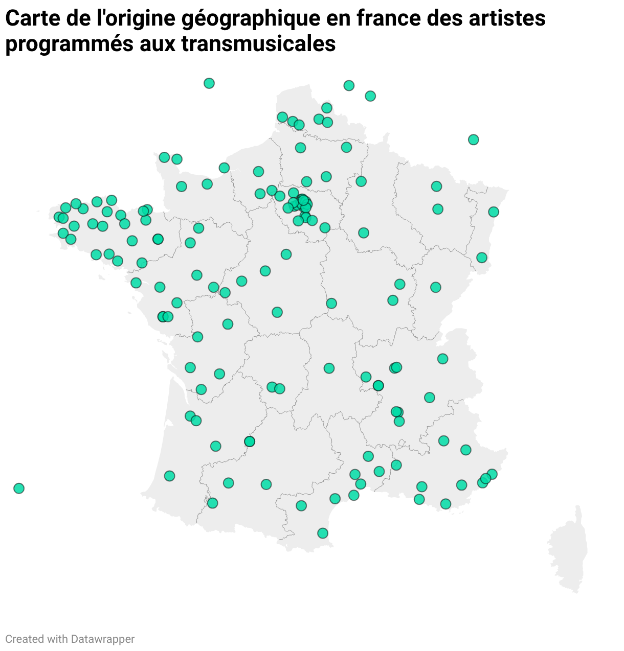 Carte de l'origine géographique en france des artistes programmés aux transmusicales
