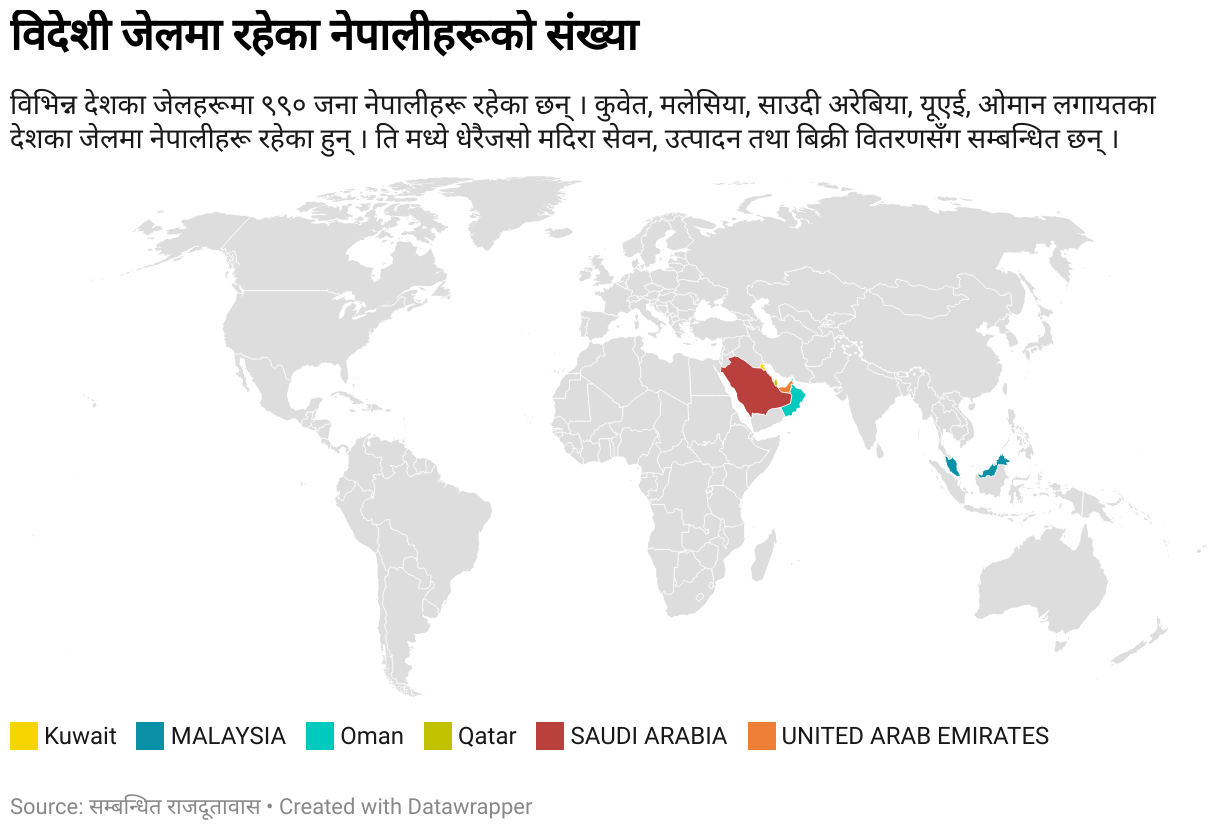 विभिन्न देशका जेलहरूमा ९९० जना नेपालीहरू रहेका छन् । कुवेत, मलेसिया, साउदी अरेबिया, यूएई, ओमान लगायतका देशका जेलमा नेपालीहरू रहेका हुन् । ति मध्ये धेरैजसो मदिरा सेवन, उत्पादन तथा बिक्री वितरणसँग सम्बन्धित छन् ।