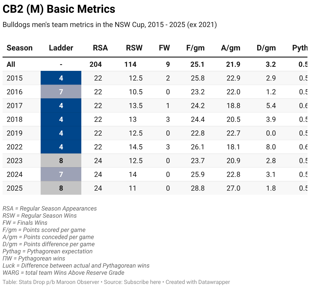Bulldogs men's team metrics in the NSW Cup, 2015 - 2025 (ex 2021)