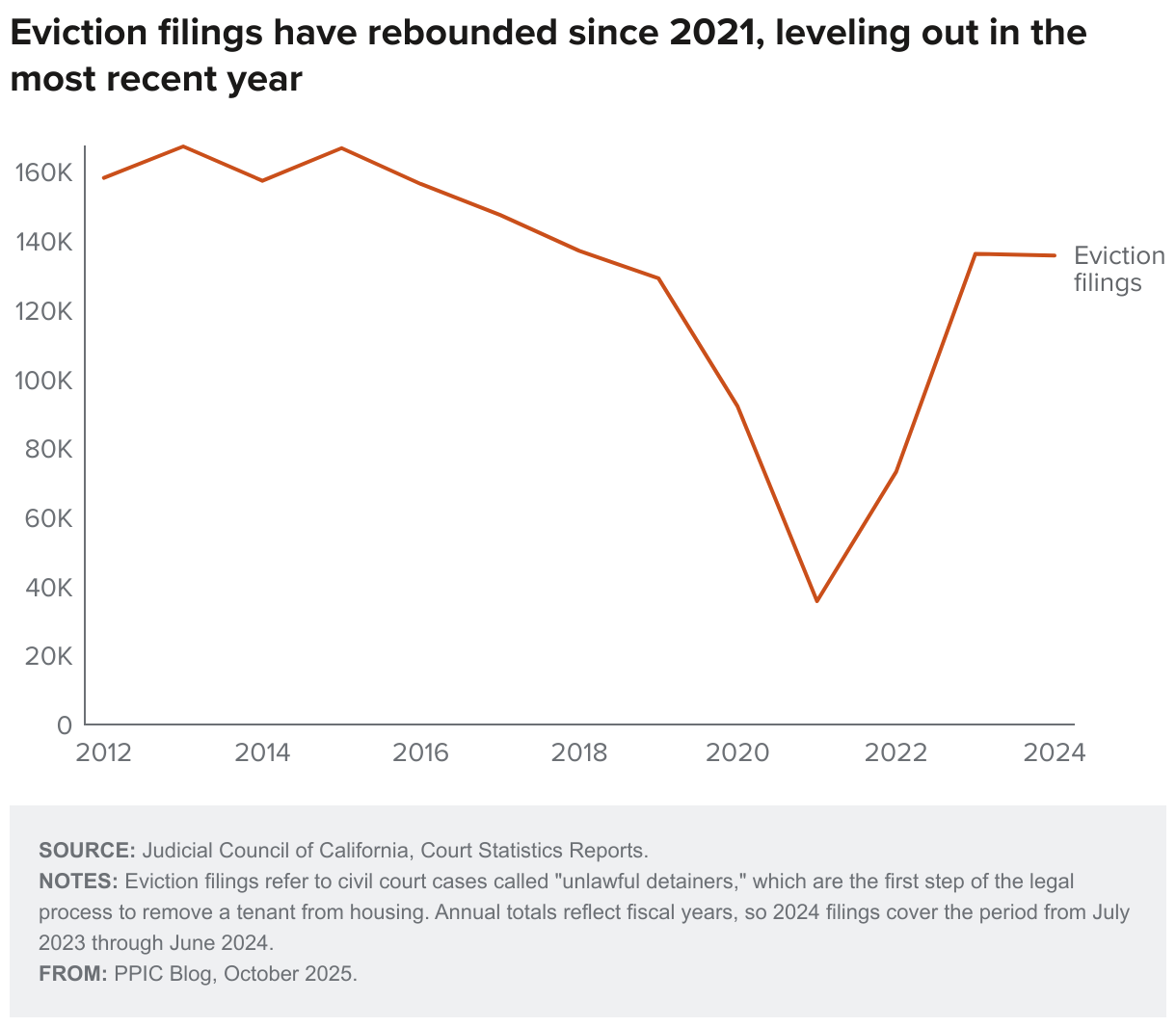 Eviction filings have rebounded since 2021, leveling out in the most recent year