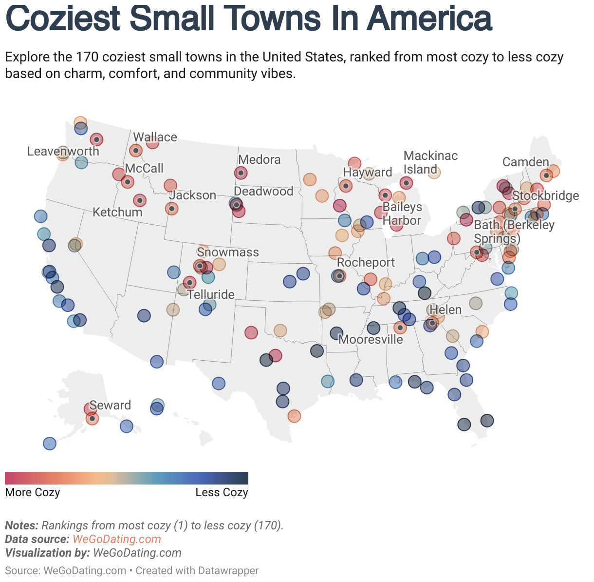 Alternative Description: This map highlights 200 small towns in America ranked by coziness. The color gradient transitions from warm (most cozy) to cool (less cozy). Each town's ranking is interactive for more details.