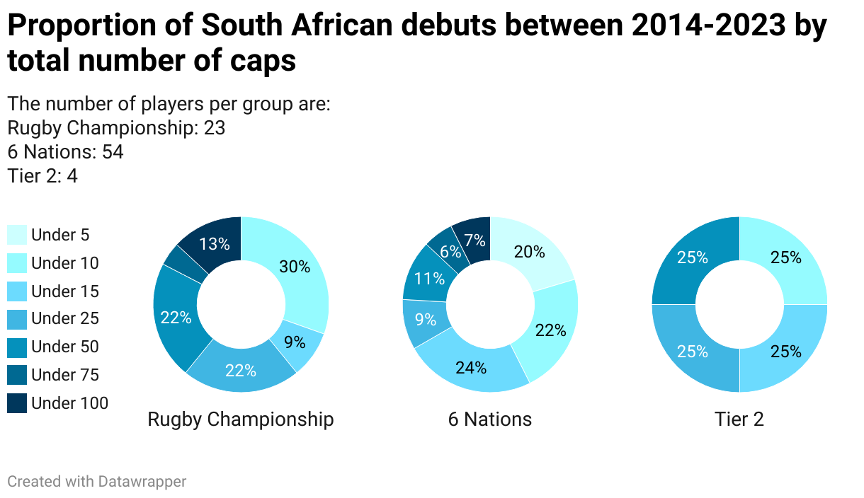 The number of players per group are: Rugby Championship: 23 6 Nations: 54 Tier 2: 4