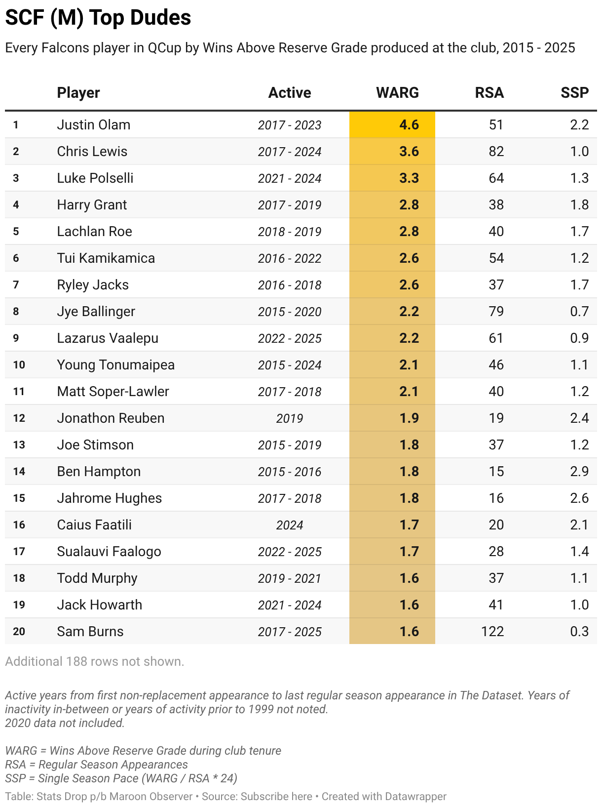 Every Falcons player in QCup by Wins Above Reserve Grade produced at the club, 2015 - 2025